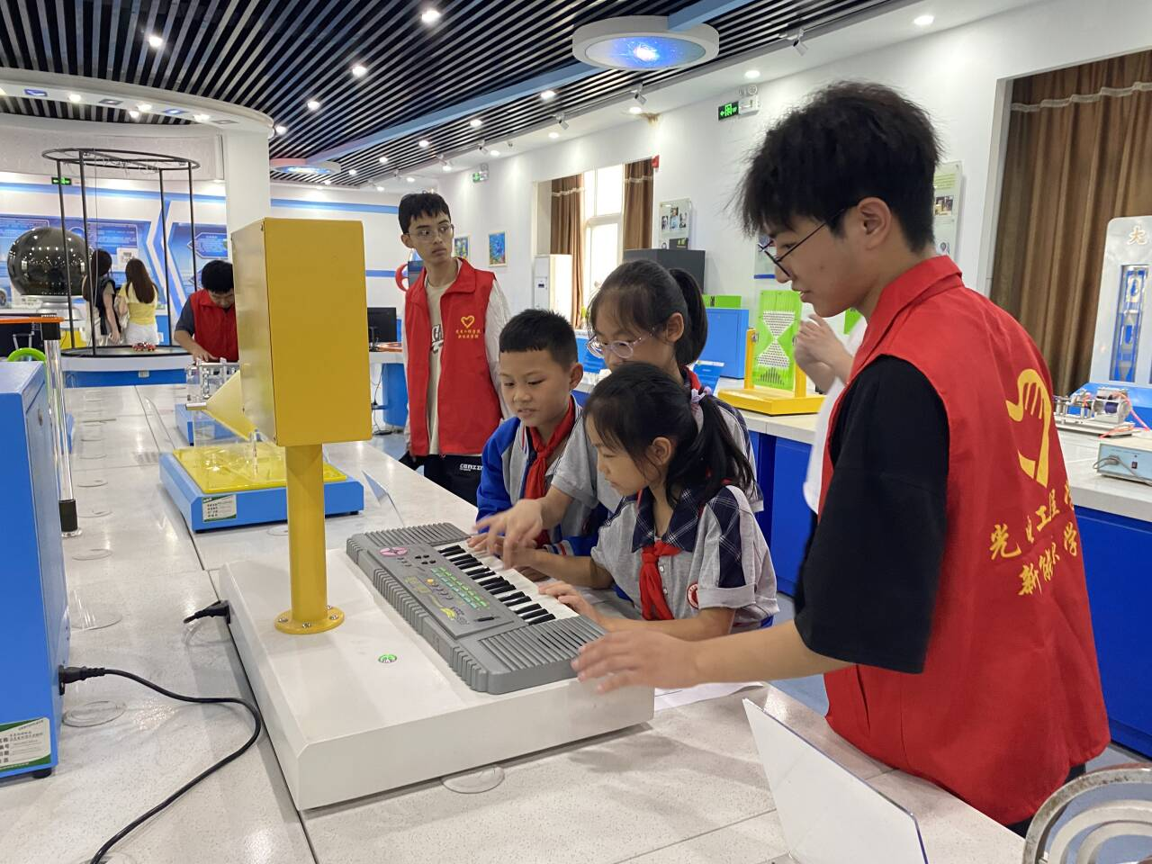 活动中,毛书哲结合小学生认知特点,用通俗语言介绍实验室概况与安全须知。随后,师生、志愿者引导同学们分组参观物理实验装置,光的折射反射演示、电磁感应现象展示、力学原理趣味互动等环节,牢牢吸引学生目光,激发探索兴趣。